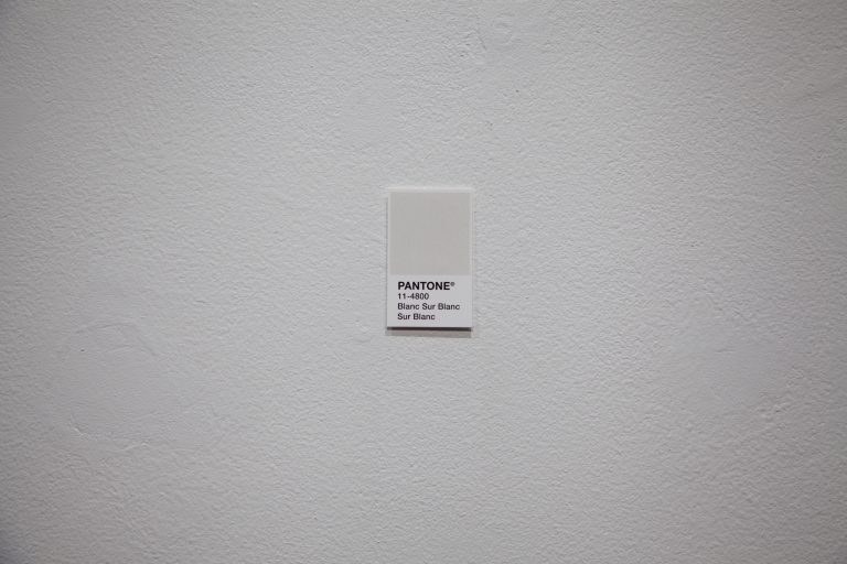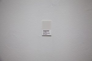 The image is of a faux Pantone chip called Pantone 11-4800 (Blanc Sur Blanc Sur Blanc). The first part of the title refers to the proprietary numerical classificatory system of color the Pantone corporation owns – the original name for 11-4800 is Blanc de Blanc (translation: White from White) and it is considered the whitest white Pantone has classified. The variation and change of name I made from Blanc de Blanc to Blanc Sur Blanc Sur Blanc is a conceptual move to reconsider the potentially fixed gesture that white from white might state – and introduce an idea that the white colors are layered on top of one another and are, therefore, an adjustable stack of concepts not fixedly “from” one another. There are a minimum of three white colors to the work, visually speaking: the white Pantone color, the substrate (white paper) it’s printed on, and the painted gallery wall behind the work. The parenthetical part of the title also is a French-English phonetic play on words – in French it means White On White On White, but when pronounced in American English it becomes “blank, sir, blank, sir, blank,” absurdly insisting, as many do both artistically and socio-politically, that the color white is blank or a default base from which to begin constructing our works and worlds from. Are there slippages and implications thereof in the language and aesthetics we chose? Are they linked to the systems, literally, and figuratively, keeping these things structurally in place. It’s also an analyzes on the social construction of whiteness and the impact it has on culture when deployed as an ideological strategy tethered to power and social status.